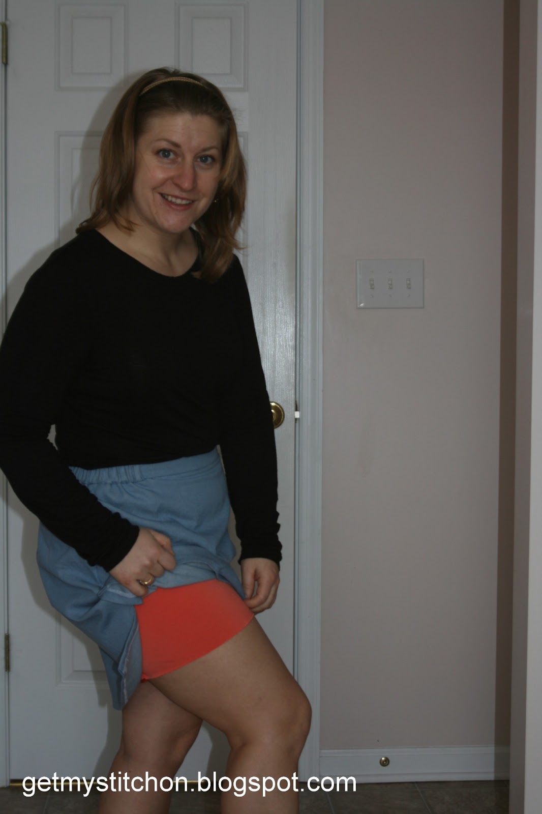 Using a non-stretchy fabric for the skirt made the assembly much easier than my first version. I still had a bunch of the bright orange knit left so I used that for the shorts again. This time I lengthened the legs of the shorts by 2", which is more comfortable for me. I also lengthened the skirt by 2" as I did in my first version.
